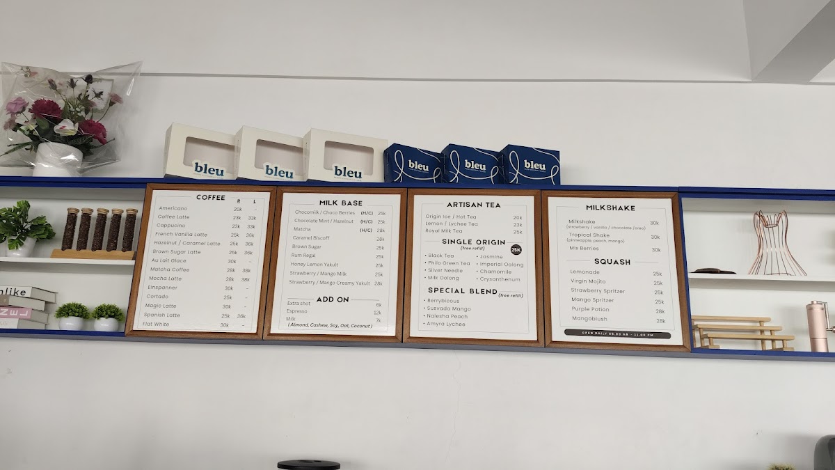 Welcome to Bleu Pastry & Coffee, a hidden gem nestled in the lively area of Malang. This newly opened café boasts a serene ambiance characterized by its striking blue and white décor, perfect for relaxation or focused work. The spacious outdoor area enhances the café's calming vibe, making it an ideal spot to unwind after a busy day.